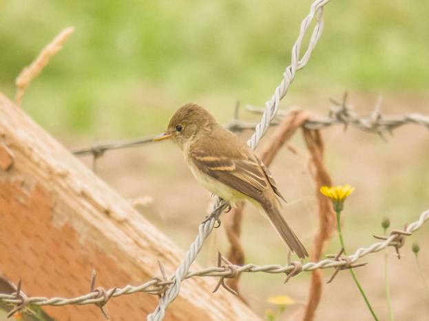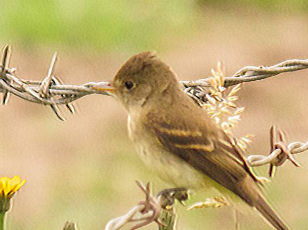 A couple of Cedar Waxwings flew into that same dead tree. On my way back I stopped to play for Sora and Wilson's Snipe again, and I saw a group of 3 or 4 juvenile Common Yellowthroats. There were some European Starlings in a field, so they went on my list. Likewise some House Sparrows and a Killdeer. Another flycatcher showed up, and I got this picture.