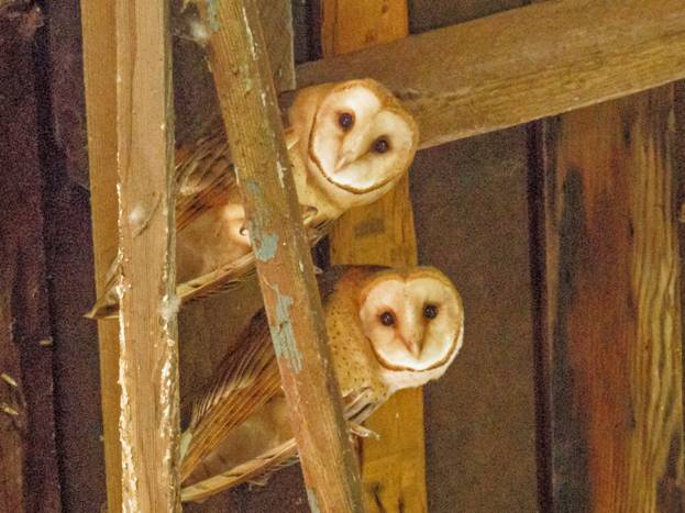 As I drove away from Fox Road, I saw a Eurasian Collared-Dove on a wire. My next stop was the Bank Swallow colony in Lyman. I watched for about 5 minutes, but I never saw any go in or come out of any of the nest burrows, so I guess they are done nesting for this season. I moved on to the house of Gary, the birding acquaintance that I had seen at Hayton Reserve on Thursday. He is the one who has Barn Owls in his barn. He had told me there were four of them now, presumably two juveniles and the parents. I found two Barn Owls, and they were sitting where I could take pictures. There was very little light in the barn, so the picture isn't very sharp, but here are two Barn Owls, presumably juveniles.