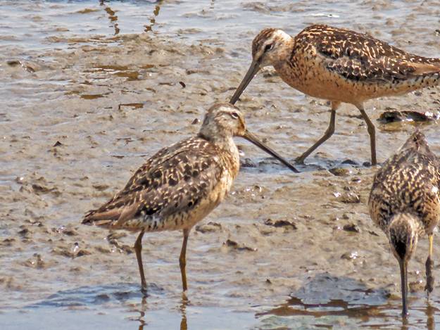 There were a number of dowitchers feeding in the mud. I took a lot of pictures, and I have decided that I saw both Short-billed Dowitchers and Long-billed Dowitchers. The identification of the two species is very tough, but here are some pictures that I think I have identified. First, some Long-billed Dowitchers, which are the more common ones at this date.