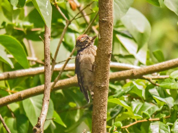 He looks very scruffy, and I think that is because he is getting his adult feathers. Here are a couple more shots of him in a bush near the feeder. He was pecking at the branch, so I guess he knows he is supposed to be finding bugs.