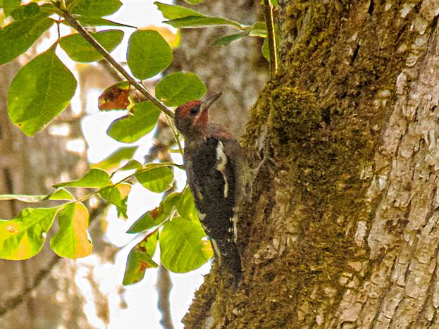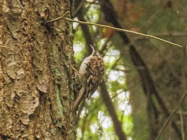 I did manage to call in a Brown Creeper. It hung around for a while, creeping up one tree trunk after another. There was very little light in the deep forest on an overcast morning, but I got two poor pictures that show the Brown Creeper.