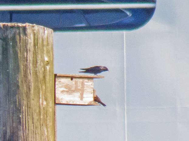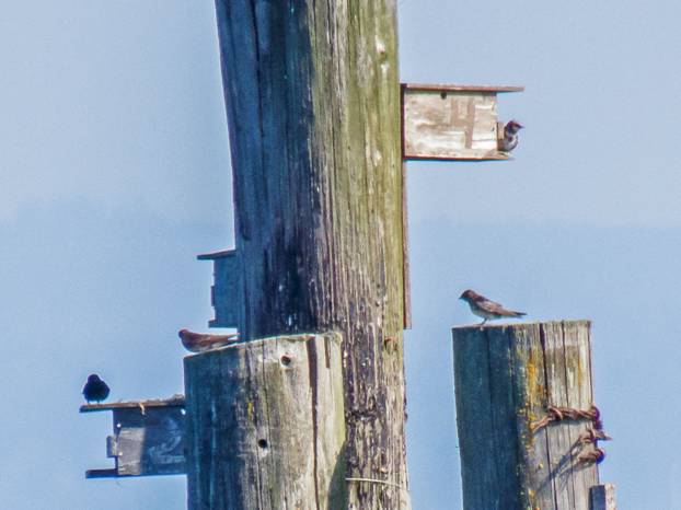 That was Wednesday. Yesterday it rained, and today I went up to Yost Memorial Park in Edmonds. I walked in the woods and played some bird calls, but it was really quiet, and I never saw or heard anything interesting. I drove down to the waterfront and walked out on the fishing pier. I was glad to see that the Purple Martins were still hanging around their nest boxes, out in the bay. That was a good August bird, because they will be flying off south soon. Here are some pictures of Purple Martins around their nest boxes.