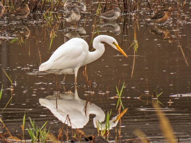 It was drizzly this morning, but it was supposed to stop, so I headed north. My first destination was Tulalip Bay, but as I drove past the Everett sewage ponds on the freeway, I spotted a large white bird at the little wetland to the north of the ponds. I got off the freeway at the next offramp and doubled back to check it out. As I had suspected from my 67 mph look, it was a GREAT EGRET, a rare bird for Western Washington. There has been a Great Egret around Everett for the last couple of years, and I had seen it a handful of times, but this was my first Great Egret of 2020. Here are three pictures of the rare (for Western Washington) Great Egret.
