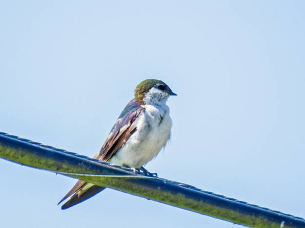 I went up to Skagit county today, about an hour north of home. My first stop, after picking up a tuna sandwich at Subway, was Fox Road, east of Mount Vernon. I was hoping to get Sora and/or Wilson's Snipe, although I didn't really expect either one of them. As I drove along Fox Road, there were swallows on a wire, so I stopped and took a look. Most of them were Violet-green Swallows, a species I already had this month. Usually I see Barn Swallows there, and there were a few, but this flock of Violet-green Swallows must have been migrating through. Here are three pictures of Violet-green Swallows.
