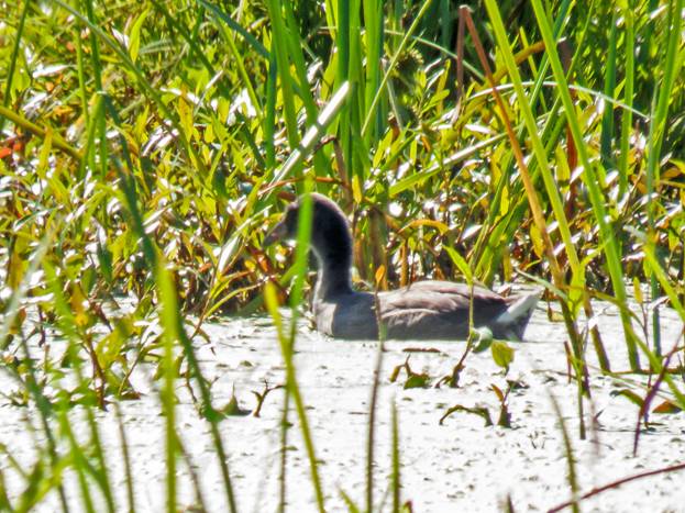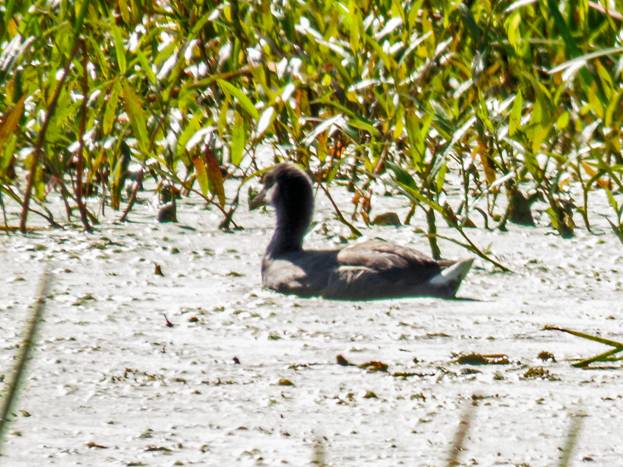 I couldn't get an answer to Sora or Wilson's Snipe calls, but at one stop I did see a juvenile American Coot, which I needed for August. The light was terrible, reflecting off the water, but here are a couple of heavily processed pictures of the juvenile American Coot.