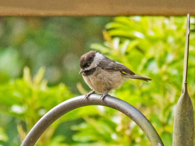 Most birds come to the feeder and eat for a while, but Black-capped Chickadees almost always fly in, grab a seed, and take it away to eat it. Here is a Black-capped Chickadee with its seed, about to fly off with it.