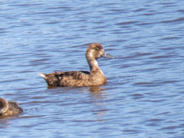 Female Lesser Scaup usually have white crescents on their face, where the face meets the bill, but this bird didn't have them. One of my field guides said sometimes they are faint, or even missing, and I can see faint white crescents on this duck's face. They are usually much more obvious, and that really had me going for a while. Here are more pictures, showing the juvenile scaup.