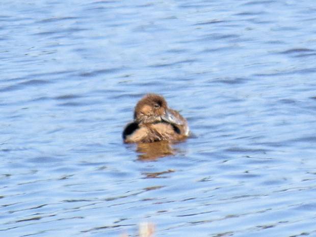 I moved on to West Beach county park and looked around some more. I saw a Common Loon there, another repeater. I continued on my way, and there were some interesting ducks on what I guess is called Swan Lake, across the road and to the north of West Beach county park. I couldn't figure out what they were, so I took a lot of pictures, hoping I might be able to identify them later. There were five smaller ducks and one larger one. I eventually realized that it was a mother duck and some well-grown juveniles that were following her around. I had to do some research, with my field guides and online, but I decided they were Lesser Scaup. Here are some of my pictures.