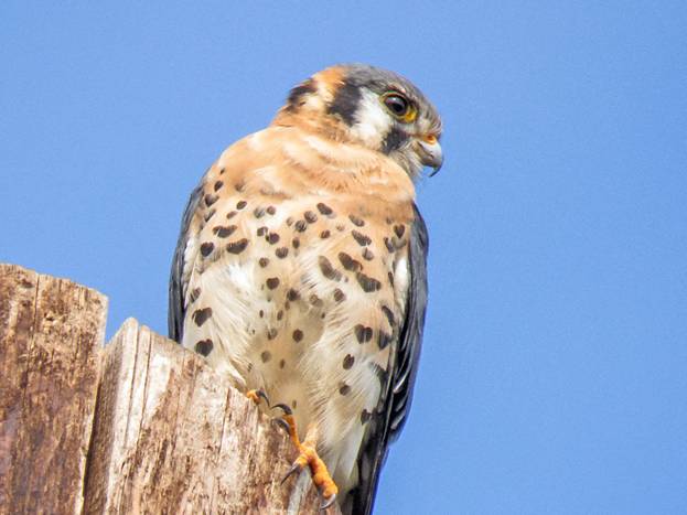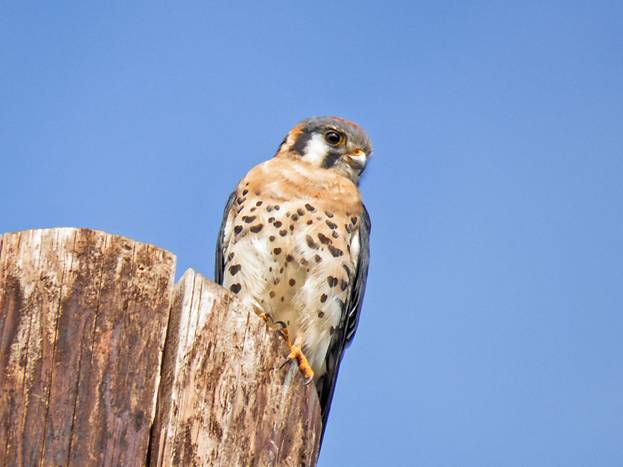 After I got that picture, in difficult light, the bird flew to a nearby post, where the light was better. Here are more shots of the male American Kestrel.