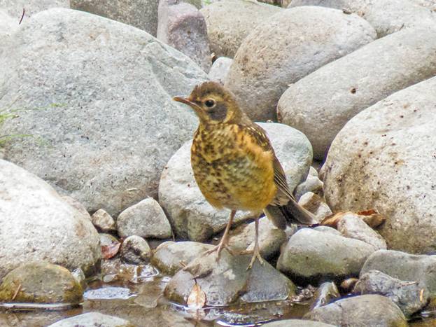 I moved on, and I didn't find anything of interest at the house in Carnation with feeders. I stopped at the bridge over the Tolt River, just south of Carnation and tried for dipper there, but saw nothing. I drove up to the bridge over Tokul Creek, on Fish Hatchery Road, which is my usual spot for American Dipper. I looked carefully from the bridge, up and down the creek, but couldn't find a dipper. I tried walking to where I could see part of the Snoqualmie River bank, where the creek runs into the river, but no dippers there, either. I would have liked to go down to the river bank, but the path down was steeper than I was willing to risk. Back at the bridge again, I did see some robins. Here is a juvenile American Robin.