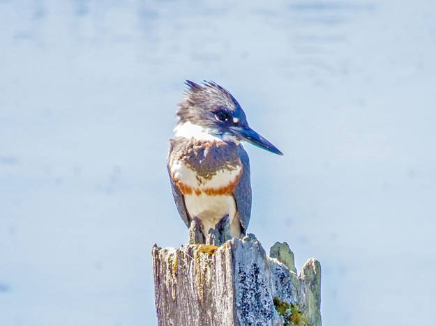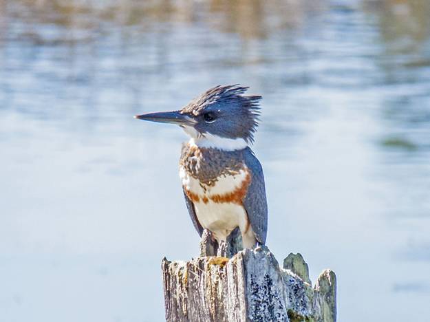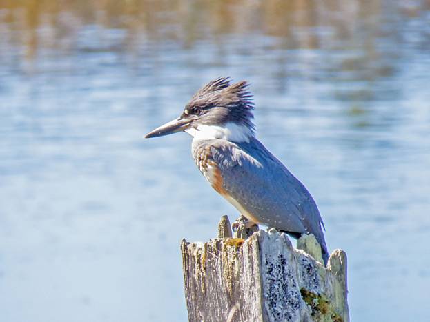 I went to the Edmonds Marsh and played Marsh Wren songs. No joy there, but I did see a female Belted Kingfisher and got these next three pictures, despite the difficult light, which was coming from behind the bird.