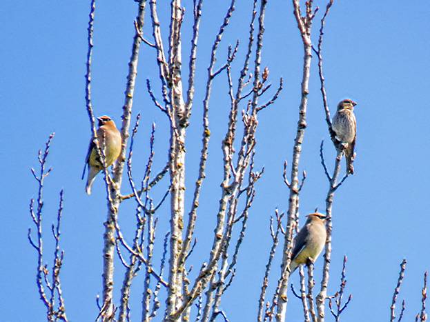 Here's a distant picture of a couple of adult Cedar Waxwings and what I think was a Purple Finch.